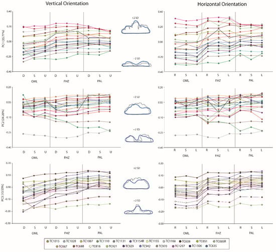 Table 2 provides descriptive statistics for PCs 1–3 in each orientation, along with the Wilcoxon sign ranked tests between the standard (i.e., non-deviated) view and each 5° variation of that view. PC1 and PC3 present with more significant differences compared to PC2, which likely relates to their relationship with size-related (i.e., relative height and breadth) shape changes. All significant differences occur within the FHZ and OML views and all significant differences involve some deviation in a vertical component (i.e., left-straight and right-straight deviations did not result in any significant differences). As individuals are oriented further inferiorly, they tend to display significantly shorter heights relative to breadth (i.e., more negative-loading PC1 and PC3s). This can be seen in Figure 3, which shows PC1–PC3 values (with associated contours) against 5° vertical and horizontal deviations (diagonal views not pictured).