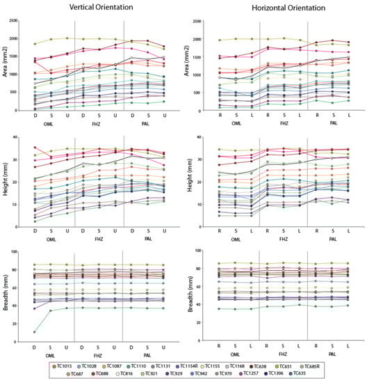The interpretations of the PC results were confirmed by analyzing the sinus area, height, and breadth measurements. Table 3 provides descriptive statistics for these variables in each orientation, along with the Wilcoxon sign ranked tests between the standard and each varying 5° orientation within each view (e.g., FHZ standard vs. FHZ left up). OML and FHZ displayed significant differences in area and height for most views, while PAL only displayed significant differences in height. Again, deviations without any vertical component (i.e., right straight and left straight) did not result in significant differences. There were no significant differences in breadth among the 5° deviations and any of the three standard views. These results are best illustrated in Figure 4, which shows individual area (top graph), height (middle graph), and breadth (bottom graph) dimensions against 5° vertical and horizontal orientations (diagonal views not pictured). Note the relatively stable breadth dimensions, with one exception in the OML down view (see discussion).