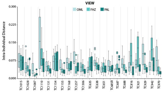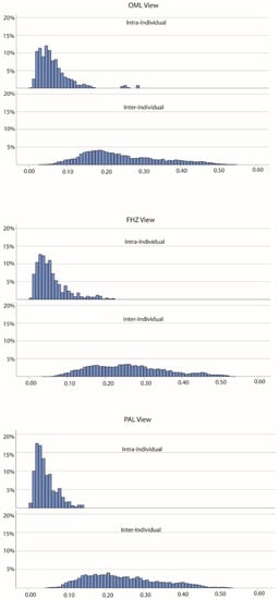 Figure 5 provides histograms of the intra-individual and inter-individual distances for each standard view, while Table 4 provides the descriptive statistics and Mann–Whitney U Test results. For each of the three views, the intra-individual distances were significantly lower than the inter-individual differences (all p-values < 0.005). When comparing the intra-individual distances across the three views, a Kruskal–Wallis test indicated significant differences (test statistic = 118.22; p < 0.001). Follow up Mann–Whitney U tests on the intra-individual distances found that the significant differences between all views: OML versus FHZ (Z = −3.277; p = 0.001); OML versus PAL views (Z = −10.676; p < 0.001); and FHZ versus PAL views (Z = −7.252; p < 0.001). Figure 6 provides a boxplot for the intra-individual distances, by individual and view. Notably, the median and range of intra-individual distances are higher among OML views for most individuals compared to the FHZ and PAL views.