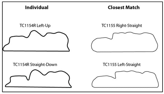 Still, all three views showed high reliability in outline matching. For the PAL and FHZ views, all 189 outlines matched with outlines from their same individual, for a correct match rate of 100%. The OML view had a correct match rate of 98.94%, with only two instances where outlines most closely matched to a different individual. Interestingly, both mismatched instances included the same two individuals, but different paired orientations: TC1154R left-up to TC1155 right-straight and TC1154R straight-down to TC1155 left-straight. Visual assessment of these outlines suggests striking morphological similarities, as seen in Figure 7. Overall, these results suggest that although the 5° deviations returned statistical differences in the Wilcoxon sign rank tests, these deviations are not likely to impact forensic sinus matches in practice, particularly for the PAL and FHZ views.