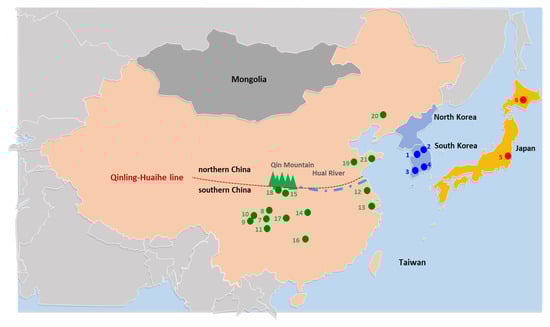 Sampling locations of Bombyx mandarina sequenced in this study and obtained from public data. General locality names are as follows: 1, Gapyeong; 2, Inje; 3, Gwangju; and 4, Sacheon (from South Korea); 5, Tsukuba and 6, Hokkaido (from Japan); 7, Ziyang; 8, Nanchong; 9, Hongya; 10, Pengshan; 11, Luzhou; 12, Yancheng; 13, Suzhou; 14, Yichang; 15, Ankang; 16, Hunan; 17, Chongqing; 18, Shiquan (from southern China); and 19, Qingzhou, Shandong; 20, Shenyang, Liaoning; and 21, Haiyang (from northern China). Coordinates of the sampling sites for South Korean individuals are as follows: 1, Gapyeong, 37°57′54.5″ N, 127°26′35.7″ E; 2, Inje, 37°55′46.1″ N, 128°23′15.9″ E; 3, Gwangju, 35°10′47.4″ N, 126°56′27.6″ E; and 4, Sacheon, 35°04′22.6″ N, 128°00′37.9″ E.