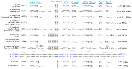 For further comprehensive comparison of the A + T-rich region structure, publicly available sequences of B. mandarina were downloaded from GenBank (Table S2). These included 5 individuals from Japan and 12 from China, respectively, which were originally reported by Sun et al. [22].