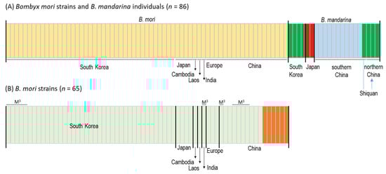 With regard to the progenitor of B. mori, Chen et al. [23] first detected the presence of two subtypes in the Chinese B. mandarina, each in the southern and northern regions, concordant to the Qinling–Huaihe line, using mitogenome data, and showed that northern Chinese B. mandarina are an immediate progenitor for B. mori strains. The data obtained in the present study also support those of Chen et al. [23], but our Nm estimates (Figure S1), heatmap analysis, based on unrooted pairwise genetic distance (Figure 5) and further sophisticated model-based phylogeny (Figure 6 and Figure S3) with the inclusion of South Korean B. mandarina, support that those from both northern China and South Korea are equally the closest group to B. mori strains. Furthermore, one B. mandarina that originated from Shiquan in China, which is located south of the Qinling–Huaihe line in close proximity (Figure 1), was also grouped together with the northern group in both the heatmap analysis and phylogeny (Figure 5, Figure 6 and Figure S3). Similarly, Sun et al. [22] using the concatenated sequences of COI and the A + T-rich region, showed a consistent result that the immediately closer Chinese B. mandarina to B. mori strains all originated from both the border of the Qinling–Huaihe line (Sichuan and Hubei) and northern China (Shanxi), given that no South Korean samples were included. Considering the vast size and topographical diversity of both northern and southern China, additional sampling could be essential, including of the regions near the Qinling–Huaihe line.