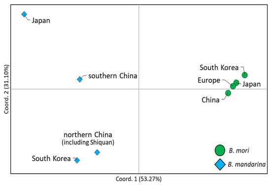 To detect and plot the relationships among B. mori and B. mandarina groups, principal coordinate analysis (PCoA) [60] was performed via covariance, with standardization of the genetic distances (FST) using GenAlEx ver. 6.5 with default parameters [61]. To increase the robustness of the analysis, each population with more than two haplotypes was included in the PCoA. Therefore, B. mori strains originating from Cambodia, Laos, and India were excluded and one B. mori strain from Italy was grouped with those from Europe.