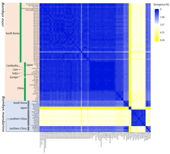Unrooted pairwise genetic distance among B. mori strains and B. mandarina individuals was calculated using PAUP ver. 4.01b10 [56]. The degree of individual differentiation was visualized as a heatmap using the online tool Heatmapper ([62]; http://www.heatmapper.ca, accessed on 1 April 2021).