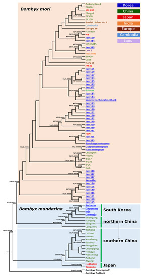 Phylogenetic analyses using ML and BI methods showed that the B. mori strains preserved and originated in different countries consistently formed a strong monophyletic group, separated from B. mandarina populations with the highest nodal supports (BS = 100%, Figure 6; BPP = 1.0, Figure S3). Within B. mori, however, on the one hand, the analyses revealed consensus topology for a few subgroups of B. mori strains, but on the other hand, showed several variable relationships with lower nodal supports for many B. mori strains between the two analyses (Figure 6 for ML analysis; Figure S3 for BI analysis). Country-based clustering in B. mori strains was detected in a few subgroups, supported with higher nodal supports consistently in both analyses (e.g., BS ≥ 70 by ML and BPP ≥ 0.9 by BI method [76]). For example, JAM124, JAM156, JAM140, JAM316, JAM161, JAM158, and JAM155, which are preserved in South Korea, formed a highly inclusive subgroup, supported strongly in both analyses (BS = 98%, Figure 6; BPP = 1.0, Figure S3). Additionally, several Chinese origin strains, such as Chunyun, Huayu, Yu37, Yu39, Jin6, and Yu5, consistently formed a highly inclusive subgroup (BS = 100%, Figure 6; BPP = 1.0, Figure S3). On the other hand, a few subgroups composed of the B. mori strains had different origins. For example, a subgroup consisting of the strains that originated from China (Handan), Japan (N4), and South Korea (JAM160 and JAM314) was strongly supported in both analyses (BS = 85%, Figure 6; BPP = 1.0, Figure S3). Furthermore, JAM315 and Sihong15 originated from South Korea and China, respectively, and formed a subgroup with higher nodal supports at BS = 95% and BPP = 1.0 (Figure 6 and Figure S3). Collectively, B. mori strains originating from different countries are phylogenetically mixed within the B. mori clade, although several country-based subgroups were detectable, indicating that the evolutionary divergence of each country-preserved B. mori strain was not substantial even though they were bred into a diverse strain in each country after domestication.