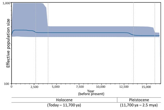 In order to assess past timing and magnitude in female effective population size (Ne) of B. mandarina, we used the Bayesian skyline plot (BSP) method [68] implemented in BEAST2 [69]. First, divergence time estimation was conducted using a strict global clock assumption in BEAST2, in order to obtain a more reasonable sense of the variability in divergence times for B. mandarina lineages. GTR + I + G with four gamma rate categories was used as a substitution model and the prior gammaShape, growthRate, and proportionInvariant.s were set to exponential, respectively. The necessary file is provided in Dataset 2. The property of convergence of the MCMC analysis was decided after inspection of the run in Tracer 1.7.2 (http://tree.bio.ed.ac.uk/software/tracer/, accessed on 3 December 2021). The first 10% of the BEAST2 MCMC run was discarded as burn-in, and the remaining samples were summarized using TreeAnnotator in BEAST2. The resulting consensus tree was checked using FigTree ver. 1.4.4 (http://tree.bio.ed.ac.uk/software/figtree/, accessed on 4 December 2021). Second, the changes in effective population size were investigated to reconstruct the demographic dynamics. For this GTR nucleotide substitution model, a strict clock [70], a substitution rate of 7.563 × 10−7 (estimated in the divergence time analysis), and coalescent Bayesian skyline with random tree were selected. The same parameters used in divergence time estimation were used to run the MCMC for BSP analysis. BSP outputs were visualized with Tracer ver. 1.7.2.