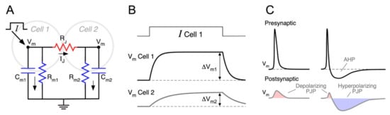 Transmission at electrical contacts is typically bidirectional in contrast to chemical contacts, which are characterized by the unidirectional flow of information from the pre- to the postsynaptic element, determined by the asymmetrical distribution of the molecular machinery involved. The expression of homotypic non-rectifying gap junction channels is a common trait of electrical contacts in mammals, where direction of current flow is solely dictated by the voltage difference between cells, being from the most depolarized to the less depolarized one. In addition, although heterologous coupling has been reported in the mammalian brain in structures such as the retina [,], the dorsal cochlear nucleus [] or some cortical areas [], the great majority of electrical coupling so far reported in these animals is homologous, that is, between neurons of the same type []. By connecting neurons of similar electrophysiological properties, particularly input resistance, junctional current will have a similar impact on the membrane potential of either coupled cell (see below). Thus, non-rectifying gap junctions, interconnecting neurons of similar electrophysiological properties, result in coupling strength of comparable magnitude in both directions, supporting bidirectional communication at the electrical synapses of mammals. The aforementioned functional differences between electrical and chemical synapses suggest that, instead of mutually exclusive, they represent complementary modalities of synaptic communication. Consistently, available experimental evidence shows that both types of transmission coexist in most regions of the mammalian brain [,,].