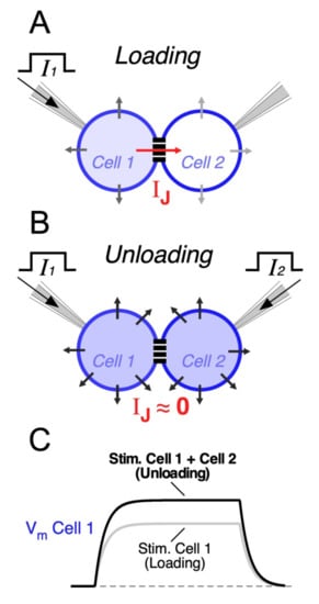 The loading effect in circuits of electrically coupled neurons. (A) Injection of a current pulse into one cell belonging to an electrically coupled pair (I1, Cell 1). While most of the current flows through the membrane of the same cell, a fraction of it will flow through the junction (IJ) and through the membrane of the coupled cell (Cell 2). (B) In contrast, simultaneous current injection in both coupled cells (I1, Cell 1 and I2, Cell 2) induces similar voltage changes in each cell making VJ close to 0, thus eliminating the flow of current through the gap junction. (C) Schematic representation of membrane voltage changes of Cell 1 (Vm Cell 1) in each of the aforementioned conditions. As the leak of current through junctions tends to be eliminated during the simultaneous injection of current into both cells, membrane voltage response in Cell 1 (Unloading, Stim. Cell 1 + Cell 2, black trace) has higher amplitude in comparison to when current pulse is applied only to Cell 1 (Loading, Stim. Cell 1, gray trace). Therefore, the loading by electrically coupled cells results in a reduction in the effective input resistance of Cell 1, as part of the current leaks to Cell 2 through the gap junction.