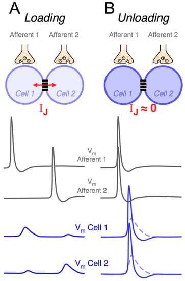 Electrical synapses enable neural circuits to perform coincidence detection. Above, schematic representation of a neural circuit composed of a pair of coupled neurons (Cell 1 and Cell 2). Each neuron receives an independent chemically-mediated excitatory synaptic input by way of corresponding afferents (Afferent 1 and Afferent 2). Traces represent schematic illustration of membrane potential of presynaptic afferents (grey, middle panel) and of membrane potential of postsynaptic electrically coupled neurons (blue, lower panel). (A) Asynchronous activation of Afferent 1 and Afferent 2 results in postsynaptic potentials in Cell 1 and Cell 2, respectively, and corresponding nearly instantaneous coupling potentials in the neighbor cell due to the spread of current through the junction (IJ) (Loading). (B) Coincident activation of Afferent 1 and Afferent 2 results in simultaneous postsynaptic potentials at coupled neurons (dashed traces), minimizing the voltage drop across the junction and hence, the junctional current (IJ ≈ 0). Cancelation of the loading effect evokes postsynaptic potentials of larger amplitude that facilitate the activation of coupled neurons (continuous traces) (Unloading).
