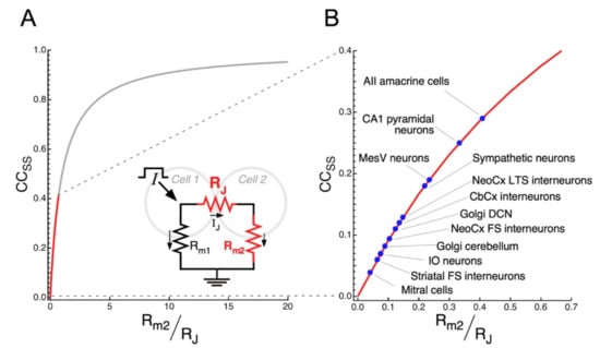Non-conductive gap junctions, corresponding to RJ , yields and CCSS , resulting in uncoupled cells as expected. On the other hand, as RJ and/or Rm2 , takes larger values, and CCSS . The CCSS as a function of is plotted in Figure 4A according to Equation (5). Despite this theoretical analysis, it is interesting to note that average values of CCSS in electrical synapses of mammals typically lie below 0.3 (red trace in Figure 4A,B), implying that small changes in , result in large modifications of the CCSS. Therefore, from this analysis it is clear that, on the one hand, changes of either the junctional resistance or the membrane resistance of the postsynaptic cell equally impact on the variable , which, in turn, result in modifications of the coupling strength. On the other hand, most synapses exist in the region where subtle modifications of either junctional or non-junctional mechanisms (RJ or Rm respectively), have a significant impact on the coupling. This suggests that, regardless of the mechanism, plasticity is a constitutive property of electrical synaptic transmission.