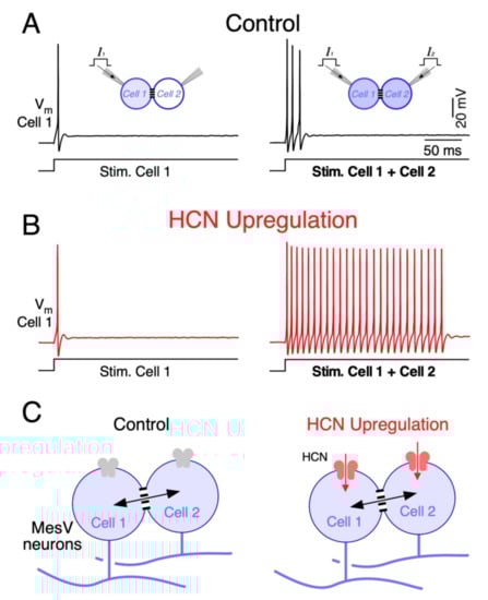 Interestingly, experimental and computational work on coupled MesV neurons showed that the upregulation of IH preferentially increases firing during coincident depolarizations, as spiking during independent depolarizations showed little changes (Figure 5A,B) []. This suggests that during independent stimulation, the increase in net inward current and the reduction in Rm due to HCN upregulation compensate for each other. Instead, during coincident inputs, the loading by coupled neurons is cancelled, mitigating part of the Rm reduction. Under this condition, the net inward current increase prevails over the reduction in the Rm, boosting neuronal excitability and supporting strong repetitive discharges. Moreover, by lowering the Rm of coupled cells, upregulation of HCN channels reduces the coupling strength according to Equations (4) and (5). Despite that, the upregulation of IH increases the contrast of neuronal output in response to uncorrelated versus coincident inputs. Therefore, by enhancing the susceptibility of pairs of coupled MesV neurons to coincident inputs, upregulation of HCN channels increases the gain of coincidence detection, despite a modest reduction in the coupling strength (Figure 5B) [].