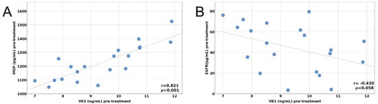 (A) Post-treatment correlation between MGP and VitK1, (B) Post-treatment correlation between Gas6 and EGFR.