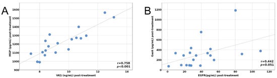 The pre- and post-treatment correlations between MGP, Gas6, EGFR, and VK1 are depicted in Figure 1A,B and Figure 2A,B.