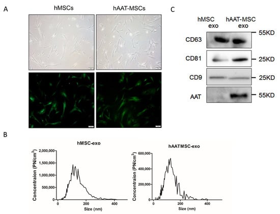 Characterization of hMSCs, hAAT-MSCs and their secreted exosomes. (A) Morphology of hMSCs and hAAT-MSCs in culture under the light microscope (upper panels) and after the cells were infected with hAAT or control-lentivirues, sorted by FACS and observed under fluorescent microsocope. Scale bar: 100 µm. Green indicates GFP+ cells. (B) Size distribution of exosomes derived from hMSCs and hAAT-MSCs measured by NTA. (C) Expression of CD63, CD81, CD9 and AAT, in hMSCs and hAAT-MSCs exosomes were detected by Western blot analysis.
