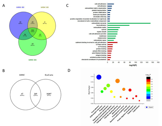 Bioinformatic analysis of hMSC exosomes. (A) Venn diagram of exosomes derived from hMSCs from bone marrow of three different donors. (B) Venn diagram of hMSC-derived exosomes against ExoCarta, an exosome database. (C) Gene Ontology analysis of hMSC exosomes. (D) KEGG analysis of hMSC exosomes.