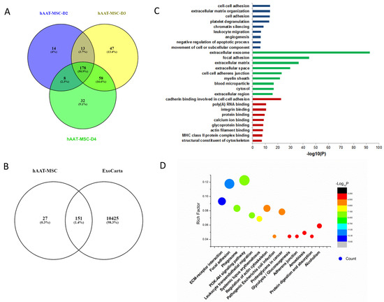 Bioinformatic analysis of hAAT-MSC exosomes. (A) Venn diagram of exosomes derived from three hAAT-MSCs cell lines. (B) Venn diagram of hAAT-MSC exosomes against ExoCarta. (C) Gene Ontology analysis of hAAT-MSC exosomes. (D) KEGG analysis of hAAT-MSC exosomes.