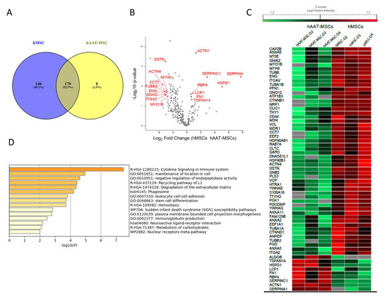 Next, common exosomal proteins from three hMSC cell lines were compared with common exosomal proteins from hAAT-MSC cells. The Venn diagram revealed 170 commonly proteins among hMSC-exosomes and hAAT-MSC-exosomes (Figure 4A). Statistical analysis indicated that 61 of the 170 common proteins were significantly different between MSCs and hAAT-MSCs (Figure 4B,C, p < 0.05). Most of the differently expressed proteins were downregulated in hAAT-MSCs compared to hMSCs, including CAPZB, ANXA5, CD44, and many others (Figure 4C). There were also several upregulated proteins in hAAT-MSC exosomes compared to hMSCs including Antithrombin-III (encoded by SERPINC1), AAT (encoded by SERPINA1, Fructose-Bisphosphate B (encoded by ALDOB), tetraspanin 14 (TSPAN14), and Alpha-actinin-1 (encoded by ACTN1) (Figure 4C). Protein pathway analysis showed that the significantly changed proteins are involved in cytokine signaling in the immune system, maintenance of location in the cell, negative regulation of endopeptidase activity, leuokocyte cell–cell, stem cell differentiation, and metabolism of carbohydrates (Figure 4D).