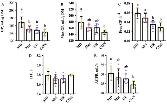 Effects of urea, methionine, and methionine dipeptide on parameters of in vitro fermentation kinetics of total mixed ration during 48 h incubation. CON = no additive, UR = urea addition, Met = methionine addition, and MD = methionine dipeptide addition. GP (A) indicates cumulative gas production at 48 h. Max GP (B) indicates ideal maximum gas production. Frac GP. (C) indicates the fractional rate of gas production. HT (D) indicates time to reach half the ideal maximum gas production. AGPR (E) indicates the average gas production rate when half of the ideal maximum gas production was produced. Means with different letters (a, b) are significantly different (p < 0.05). Vertical bars denote standard deviation (SD); n = 6 per treatment per time.
