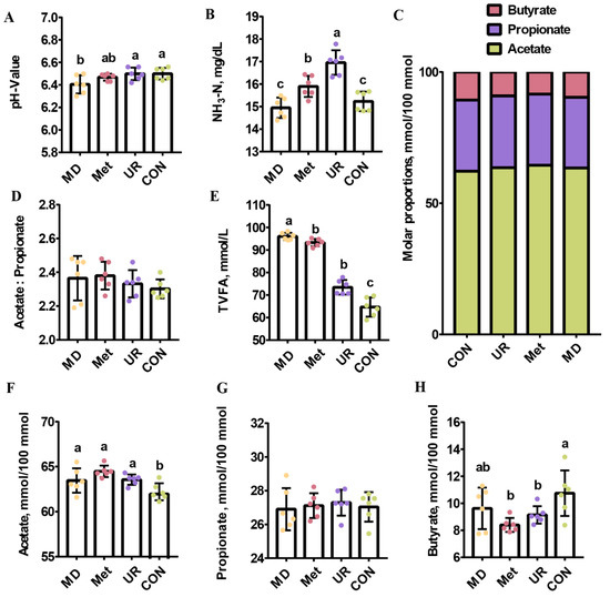 Figure 3 shows an overview of the effects of urea, Met, and MD on fermentation parameters. The pH value in the MD group was lower than in the UR and CON groups (Figure 3A; p < 0.05). The NH3-N concentration was higher in the UR group than in the other groups (Figure 3B; p < 0.05), and was higher in the Met group than in the MD and CON groups (Figure 3B; p < 0.05).