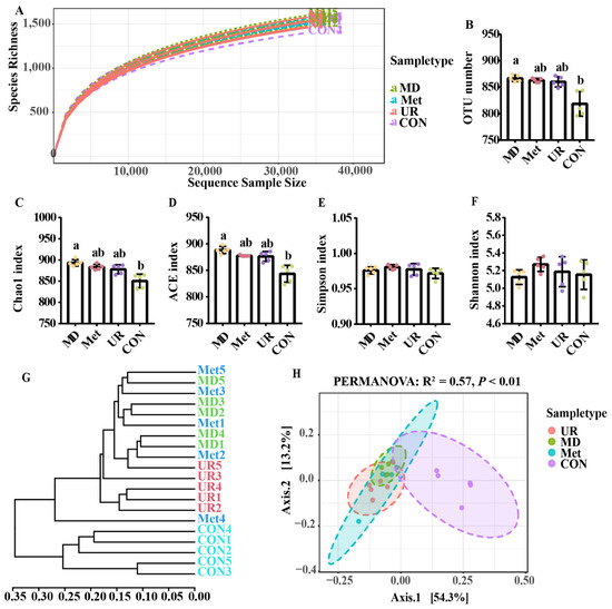 After removing low-quality reads, 2,282,354 clean reads were subjected to subsequent analysis. The rarefaction curves showed the current sequencing depth to be sufficiently representative of the microbiota (Figure 4A). When α-diversity indices were compared, no difference was observed in the richness of the microbiota across the CON, UR, and Met groups (Figure 4B–D, p > 0.10), while the richness of the microbiota in the MD group was higher than in the CON group (Figure 4B–D, p < 0.05). There was no difference in evenness across the treatments (Figure 4E,F; p > 0.05). A dendrogram analysis (Figure 4G) and PCoA plot (Figure 4H) based on the Bray–Curtis distances showed distinct clustering between the CON group and others (PREMANOVA: p < 0.01); there was a close connection between the UR, Met, and MD groups (Figure 4G,H).