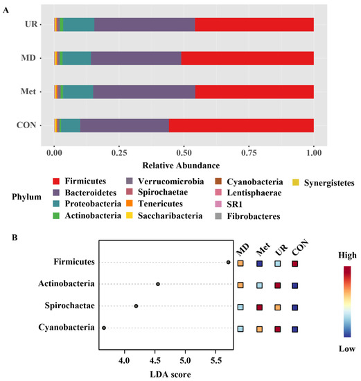 The phylum compositions and comparisons are shown in Figure 5. Among the phyla, Firmicutes (49.56%), Bacteroidetes (36.78%), Proteobacteria (10.44%), and Actinobacteria (1.00%) were predominant; the remaining minor phyla (relative abundance < 1%) are presented in Figure 5A. To identify the specific bacterial phyla associated with Met and MD, we conducted the LEfSe analysis (Figure 5B). Firmicutes was enriched in the CON group (p = 0.02, LDA score = 5.71), Actinobacteria and Cyanobacteria were enriched in the UR group (Actinobacteria: p = 0.03, LDA score = 4.55; Cyanobacteria: p = 0.01, LDA score = 3.66), and Spirochaetae was enriched in the Met group (p = 0.01, LDA score = 4.19) (Figure 5B).