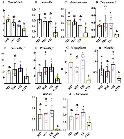 Subsequently, we summarized the relative abundance of the genera in detail, considering those that were enriched in the UR, Met, and MD groups (Figure 7). Relative abundances of Succinivibrio, Sutterella, and Auaerotruncus were higher in the MD group than in the CON group (Figure 7A–C; p < 0.05). There was no difference in the Relative abundance of Treponema_2 among the UR, Met, and MD groups (Figure 7D; p > 0.10), while Treponema_2 was enriched in the Met group and higher than in the CON group (Figure 7D; p < 0.05). No significant differences in the relative abundance of Prevotella_1, Prevotella_7, Megasphaera, Olsenella, Dialister, and Phocaeicola were found among UR, Met, and MD groups (Figure 7E–J; p > 0.10), whereas these were higher in the UR group than in the CON group (Figure 7E–J; p < 0.05).