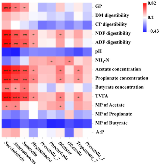 Spearman’s correlation between the relative abundance of genera and phenotypic indices. Genus were obtained using linear discriminant analysis effect size and found to be enriched in UR, Met, and MD groups. CON = no additive, UR = urea addition, Met = methionine addition, and MD = methionine dipeptide addition. Colors represent the correlation coefficient. Red represents a positive correlation, and blue represents a negative correlation. A dark color represents a stronger correlation, whereas a light color represents a weaker correlation. *, 0.01 < p < 0.05; **, 0.001 < p < 0.01; ***, p ≤ 0.001; GP, gas production; DM, dry matter; CP, crude protein; NDF, neutral detergent fiber; ADF, acid detergent fiber; TVFA, total volatile fatty acid; MP, molar proportion; A:P, acetate concentration: propionate concentration.