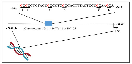 On the other hand, it has been demonstrated that the TBX5 gene is modified by different epigenetic mechanisms, including long non-coding RNAs (lncRNAs), histone modification and polycomb group proteins. These epigenetic modifications play a key role in the pathophysiology of CHDs [14,15,16,17]. Furthermore, some studies have shown that an imbalance in the status of DNA methylation could change the expression of genes that participate in cardiogenesis [8,10,18,19,20].