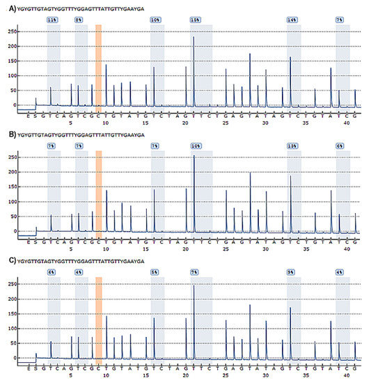Pyrograms resulting from pyrosequencing process. (A) Pyrogram of patient with ASD; (B) Pyrogram of a patient with VSD; (C) Pyrogram of a control individual. In each pyrogram, the evaluated CpG sites are identified with the letter “Y”. The X-axis describes the order of dispensing during the pyrosequencing process, starting with the enzyme and the substrate, followed by the corresponding nucleotides; the Y-axis represents the relative light intensity corresponding to bioluminescence. The height of each peak in the CpG sites is proportional to the number of nucleotides incorporated in the analysed sequence. The blue shaded areas represent the CpG sites with their corresponding percentages of methylation; the presence of an orange shaded area indicates a control bisulfite dispensing, representing a suitable bisulfite conversion process.