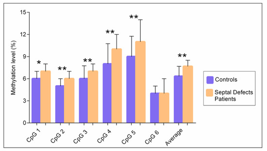 Median methylation levels for 6 CpG sites in the TBX5 gene between patients with septal defects and the controls. * p < 0.05, ** p < 0.001; Mann–Whitney U test.