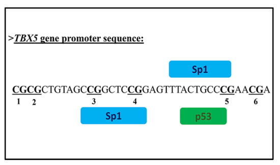 The in silico analysis with PROMO, TFBIND and AliBaba 2.1 (http://gene-regulation.com/pub/programs/alibaba2/index.html accessed on 26 September 2021) software for the possible prediction of potential transcription factors binding sites to the TBX5 promoter region indicated the binding of Sp1 (Specificity protein 1) and p53 (Tumor suppressor Trp53) transcription factors. See Figure 5.