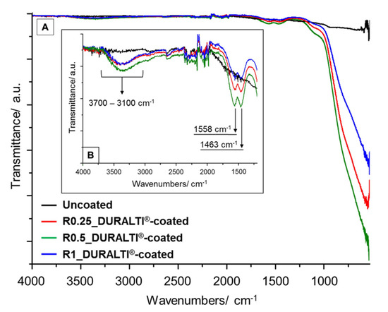 FTIR spectra of R0.25, R0.5 and R1 uncoated and DURALTI®-coated aluminum disks in the range between (A) 4000–530 cm−1 and 4000–1200 cm−1 (B).