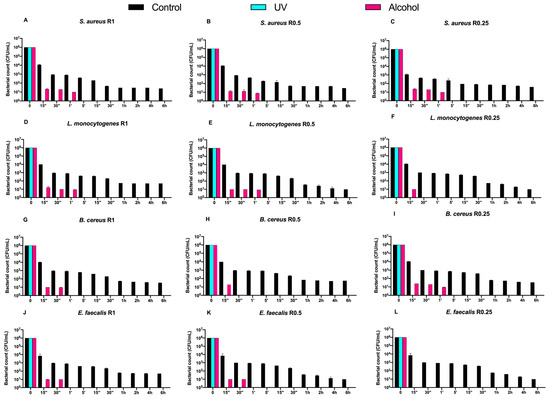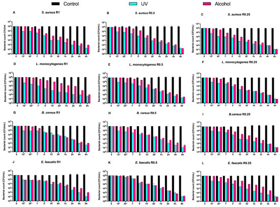 Graphical representation of Gram-positive bacterial counts (A–L) at different exposure times on uncoated aluminum disks with different surface roughness (R0.25, R0.5 and R1 μm) and subjected to UV and alcohol sanitizing methods.