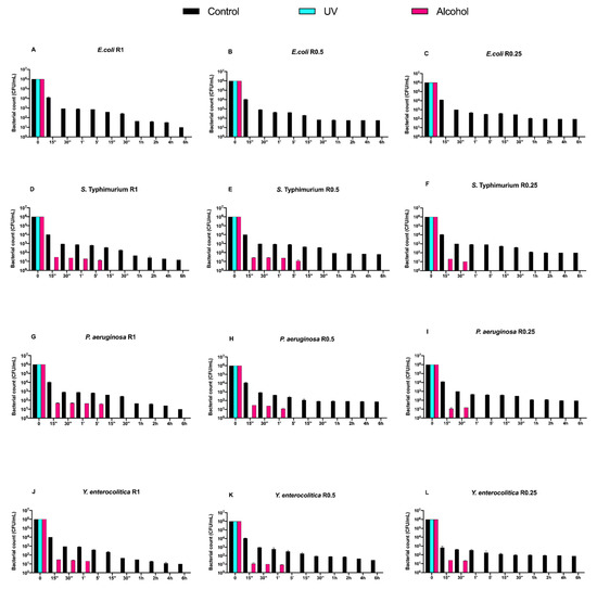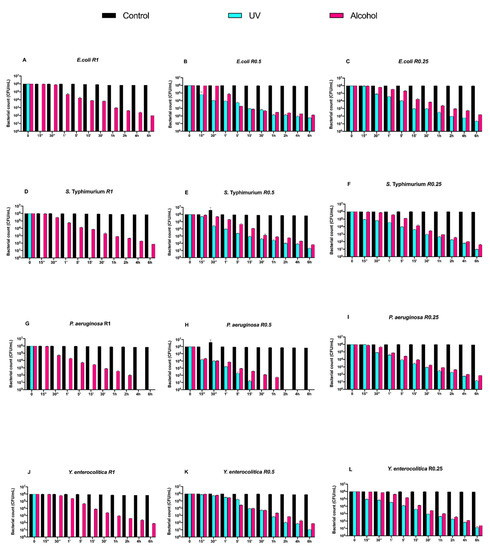 Graphical representation of Gram-negative bacterial counts (A–L) at different exposure times on uncoated aluminum disks with different surface roughness (R0.25, R0.5 and R1 μm) and subjected to UV and alcohol sanitizing methods.