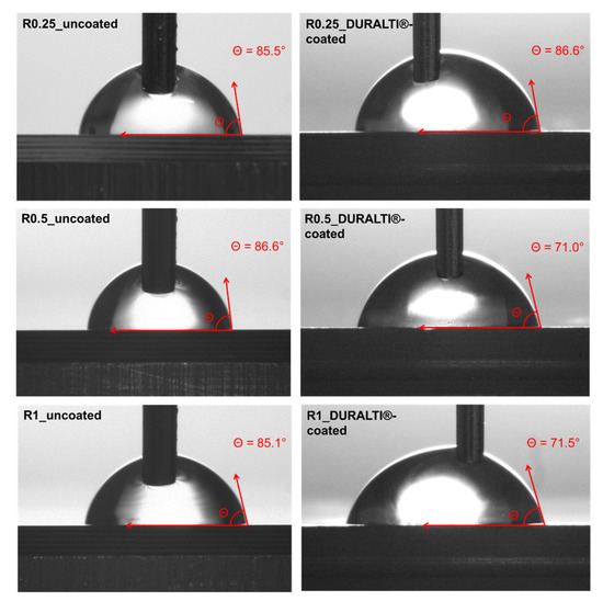 The surface wettability of the DURALTI®-coated aluminum samples with the 3 different roughness, was investigated by steady-state water CA measurements. Images and CA values of both uncoated and coated aluminum disks are shown in Figure 7 and listed in Table 1, respectively.