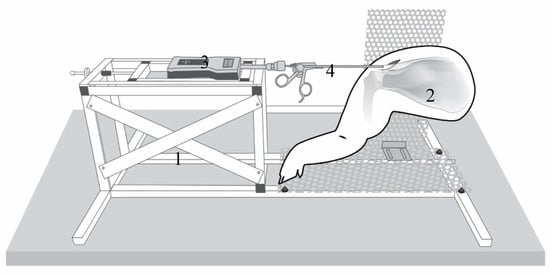 Testing station (1) with the porcine shoulder (2): The industrial force gauge (PCE-FB 200, accuracy ±0.1%, precision 0.05 N, measuring range 0.5–200 N, Fa. PCE Instruments) (3) connection to a commercial arthroscopic grasper (4) (Rotator cuff grasper: 4.2 mm shaft diameter with traumatic jaws, and a self-releasing locking mechanism from Fa. Arthrex Inc., Naples, FL, USA) modified by a custom-made aluminum fast adapter (Fa. Surgitaix, Herzogenrath, Germany).