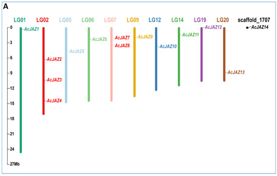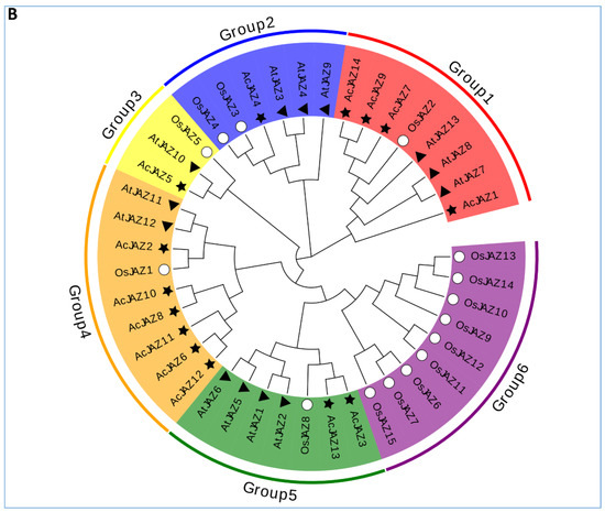 The JAZ gene family in pineapple. (A) Chromosomal locations of JAZ genes in pineapple. The respective chromosome number is indicated by different colors at the top of each chromosome. The scale on the left is for chromosomes in megabases (B) Phylogenetic relationship of JAZ proteins from Arabidopsis thaliana, Oryza sativa, and pineapple. The phylogenetic tree was created using the neighbor-joining method with 1000 bootstrap replicates by MEGA 7. The diverse groups of JAZ proteins are marked with different colors. The JAZ proteins of A. thaliana, O. sativa, and pineapple are represented by black triangles, white circles, and black stars, respectively.