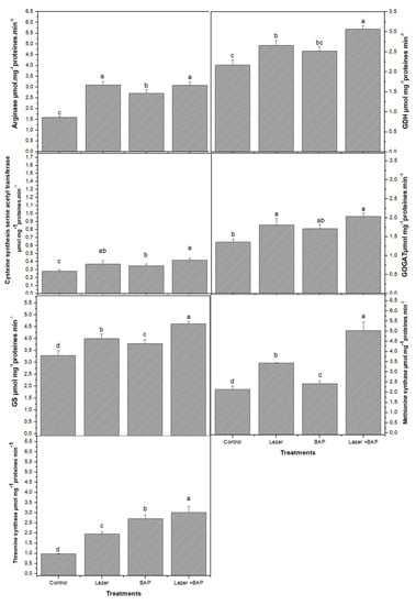 Plant growth and vital life functions rely on primary metabolites in order to function properly. Twenty amino acids were detected in linseed sprouts. The highest values were recorded for glutamine and glutamic acid (46.5 mg·g−1 FW and 34.0 mg·g−1 FW, respectively) (Table 2). Even though the difference between the two treatments was statistically minor, the laser light effect increased their biosynthesis rather than BAP priming (p > 0.05). Overall, the laser light boosted the biosynthesis of almost all the studied AAs, while the BAP seemed to be less effective on them, as only 9 out of 20 AAs showed significant differences compared to the control (p < 0.05). Combined treatment actively induced the synthesis of AAs. Interestingly, therein the greatest quantities of glutamine and glutamic acid were observed (62.53 and 50.90 mg·g−1 FW, respectively), with an increase of 34.4 and 49.7%, respectively, compared to the control. Histidine, the third major AA produced by the control group, was negatively affected by both laser light and BAP treatments as its quantity decreased; even the combined treatment could not affect its value. Furthermore, the laser light and BAP priming enhanced the activity of enzymes involved in the biosynthesis of AA and N metabolism (Figure 1). For instance, the highest activity of glutamine synthase (GS), glutamine dehydrogenase (GDH), and glutamate synthase (GOGAT) was recorded in sprouts treated with both laser light and BAP priming. The same increase trends were observed in arginase, thymine synthetase, and methionine synthetase.