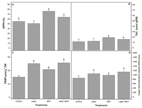 The effect of laser light, BAP, and laser with BAP priming on DPPH (%) (A), TAC (nmol/gFW) (B), and FRAP µmol.g−1.FW (C) and oxygen radical absorbance capacity (ORAC) (D) assay of linseed sprouts. The values represent the mean of three replicates ± standard error. The small letters (a, b and c) above the means show the differences (p < 0.05) between the treatments using Tukey’s test.