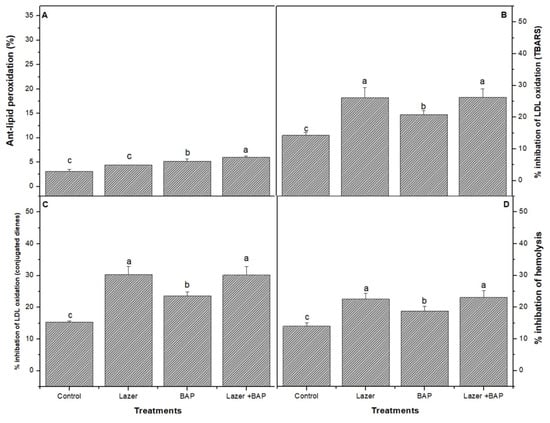 The effect of laser light, BAP, and laser with BAP priming on the % inhibition of LDL oxidation (A), the % anti-lipid peroxidation TBARS (B), the % inhibition of LDL oxidation (conjugated dienes) (C), and the % inhibition of the haemolysis of linseed sprouts (D). The values represent the mean of three replicates ± standard error. The small letters (a–d) above the means show the differences (p < 0.05) between the treatments using Tukey’s test.