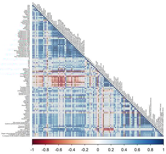 According to Pearson’s correlation coefficients between biological and chemical factors (Figure 6), the biomass accumulation of linseed sprouts was strongly correlated by all secondary metabolic, such as total phenols and flavonoids, as well as the antioxidant enzymes. Vitamins, amino acids, and enzymes involved in N metabolism were all favourably associated with total fresh and dry weights.