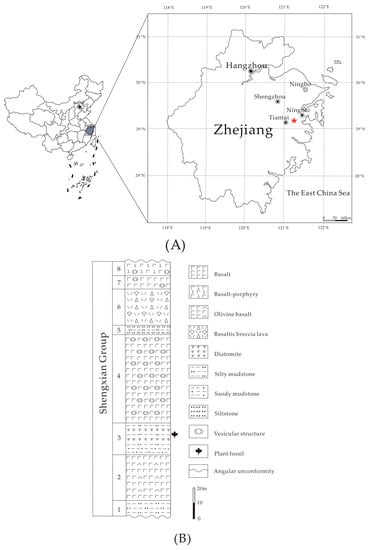 (A) Fossil site (red pentagram) of present fossil. (B) Stratigraphic column of the Shengxian Formation in eastern Zhejiang, China.