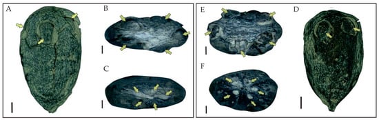 Characteristics of endocarps of Choerospondias tiantaiensis under a VHX-1000 super-depth-of-field microscope ((A–C), JHU3-16-059; (D–F), JHU3-231). (A,D): Lateral view of endocarp showing the germination pores (yellow arrows). (B,E): Top view of endocarp showing the five germination pores (yellow arrows). (C,F): Base view of endocarp showing the five apertures in a whorl (yellow arrows). (A,D), scale bar = 2 mm. (B,C,E,F), scale bar = 1 mm.