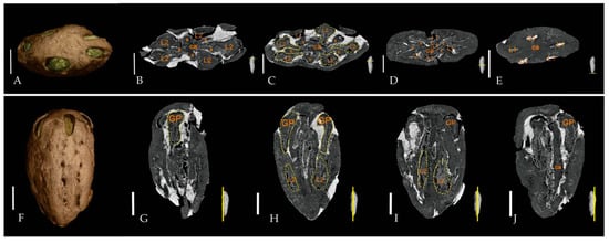 For the treatment of endocarp fossils, the surfaces of the fossils were first wiped with anhydrous ethanol and then photographed under a VHX-1000 super depth-of-field microscope. Next, we used the ZEISS Xradia 520 Versa 3D X-ray microscope at Northwest University to obtain raw CT data on the internal structure of the endocarp fossils. The data were then processed using the Visual Studio MAX 3.0 software (Volume Graphics, Germany) to obtain virtual sections. According to these processed data, the 3D structures of the fruit fossils were accurately reconstructed. In addition, transversal sections were obtained for a conventional anatomic study using the epoxy resin embedding method [32]. They were subsequently observed and photographed under a Leica DM1000 optical microscope.