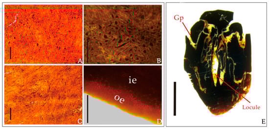 Internal structure and anatomical details of the Choerospondias tiantaiensis sp. nov. fossil endocarp ((A–E), JHU3-16-059). (A): Fibers and sclereids of the endocarp wall, scale bar = 0.1 mm. (B): Details of sclereids, scale bar = 0.1 mm. (C): Fibers structure in the septum, scale bar = 0.1 mm. (D): Irregular arrangement of fibers outside the endocarp and closely arranged sclereids inside the endocarp in transmitted light. Scale bar = 0.1 mm; oe, outer endocarp; ie, inner endocarp. (E): Longitudinal section showing the overall structure of the endocarp, locules, and germination pore (Gp). Scale bar = 5 mm.