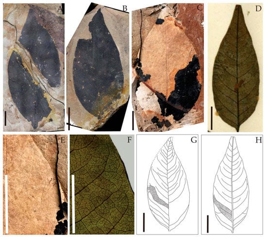 For the treatment of leaf fossils, the fossils were photographed with a Leica M165FC stereomicroscope. The cuticular analysis was performed according to the procedure described by Liang et al. [33]. The fossils were moistened well in distilled water and then soaked in 20% HCl solution for 12 h to remove calcareous sediments; then, they were washed to neutrality using distilled water. Subsequently, they were soaked in HF solution (40%) for 12 h to remove siliceous sediments and then washed again with distilled water until neutral. Next, they were transferred into 70% HNO3 reagent and immersed for 4–12 h. When the color of the cuticles changed from black to transparent light brown, the samples were taken from the solution and washed with distilled water. Next, the cuticles were immersed in distilled water for 1–2 h to fully remove any residual HNO3 in the cuticle. Following this procedure, the leaves were soaked in 0.4% NaClO solution for 5–10 s and observed under a dissecting microscope until the leaf edges showed signs of epidermal separation, at which point they were washed to neutrality with distilled water. The cuticles were stained with 1% safranin solution for less than 10 s, depending on the thickness of the leaf fossil, and then mounted. Finally, they were photographed under a Leica DM1000 optical biomicroscope.