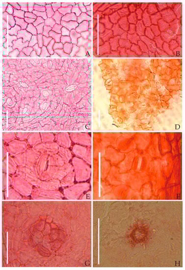 In this research, we further obtained the cuticular microstructure of fossilized Choerospondias leaves. The stomatal apparatus was found to be cyclocytic. A few multicellular trichome bases were observed on the epidermis, distributed mainly on the leaf veins. These identified features are consistent with those of extant Choerospondias leaves, as described by Zheng et al. [2]. In addition, other epidermal characteristics, including cell shape, anticlinal walls, and venation cell shape, were also similar between the fossilized and living Choerospondias leaves (Table 2). However, due to the remote gap between the late Miocene and today, we treated the fossil leaves as a new species, Choerospondias mioaxillaris sp. nov.