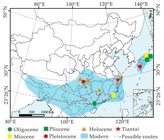 - Manchester, S.R.; Chen, Z.D.; Lu, A.M.; Uemura, K. Eastern Asian endemic seed plant genera and their paleogeographic history throughout the Northern Hemisphere. J. Syst. Evol. 2009, 47, 1–42. [Google Scholar] [CrossRef]