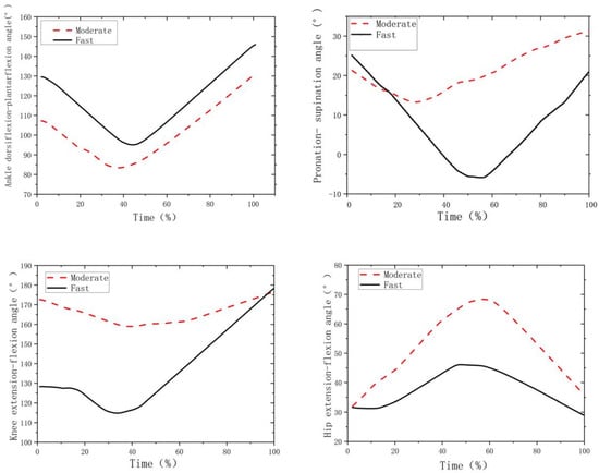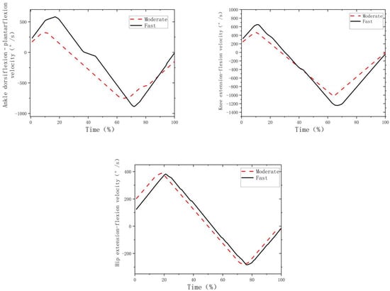 Figure 3 shows the hip, knee and ankle angular velocities during the fast and moderate movements. Compared to moderate movement (Table 2, Figure 3), the fast movement led to a higher knee extension but smaller hip extension velocities at initial contact (p < 0.001; d > 0.8), higher peak knee extension velocity (p < 0.001; d > 0.8), as well as higher knee flexion (p < 0.001; d > 0.8) and ankle plantarflexion at take-off (p = 0.033; d > 0.8).